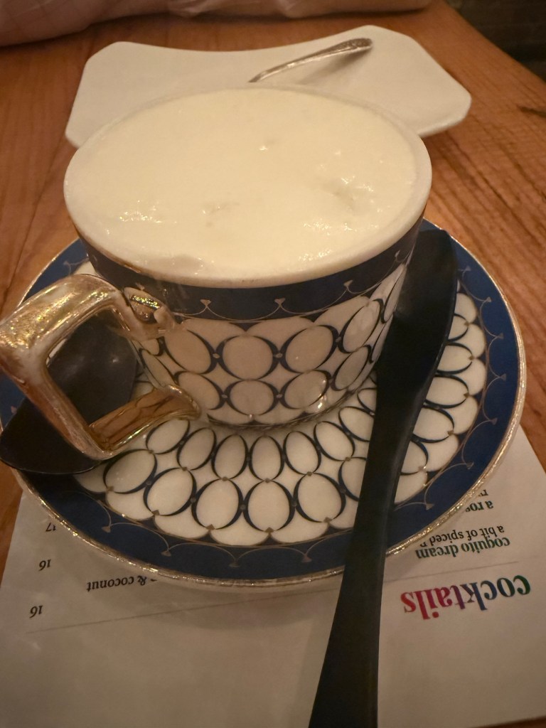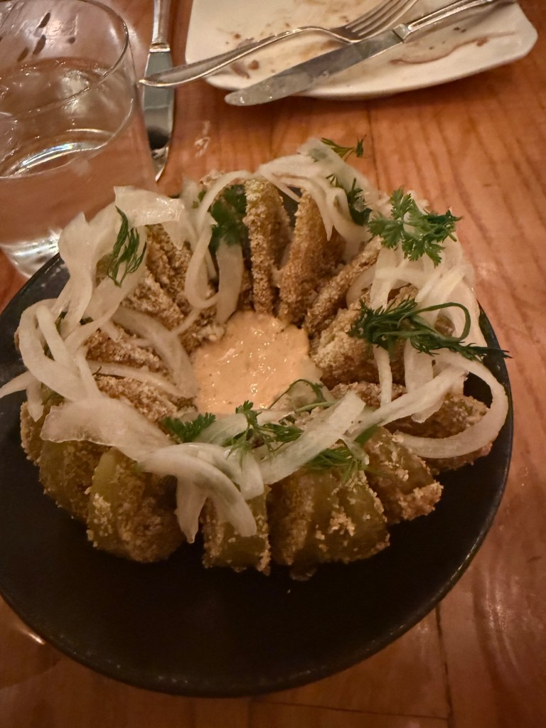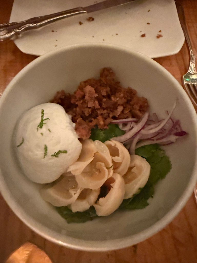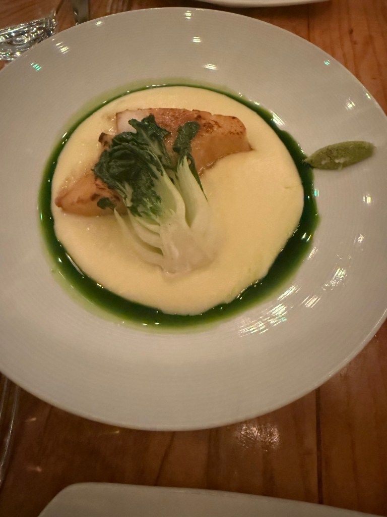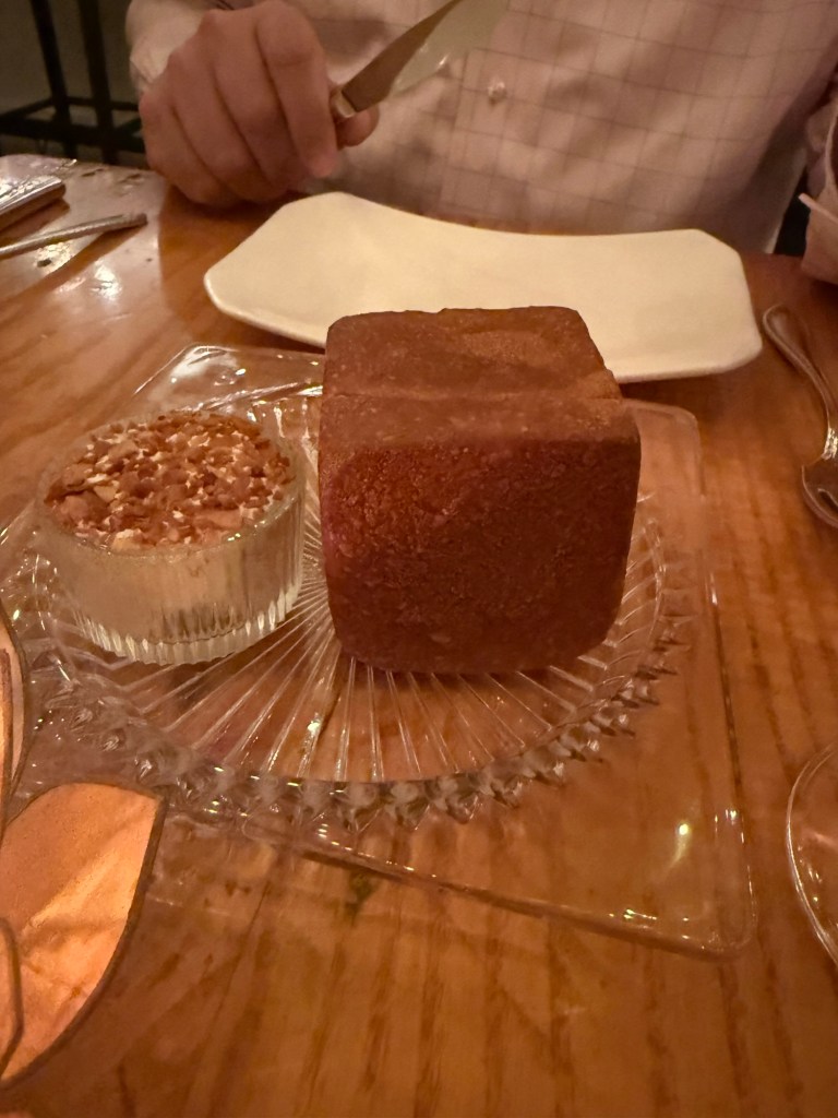 The restaurant was buzzing when we arrived. Though we checked in just before 8:30, we weren’t seated until 9:00 PM. Just as we were bracing for a very late night, a manager came over to apologize. Knowing we were celebrating a big birthday, he offered us champagne while we waited. Eric immediately recalled an episode of The Bear where a character dismissed overbooking as a “champagne problem.” It certainly made the wait feel like part of the celebration.