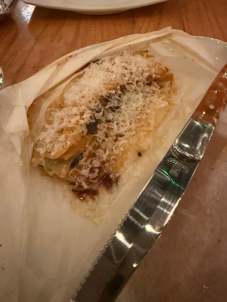 - The Pasta: Eric chose the Tteokbokki Pomodoro, a brilliant fusion of Korean street food and Italian flair. I went with the Pasta en Papillote, a white lasagna with butternut squash and brie that was savory and rich.